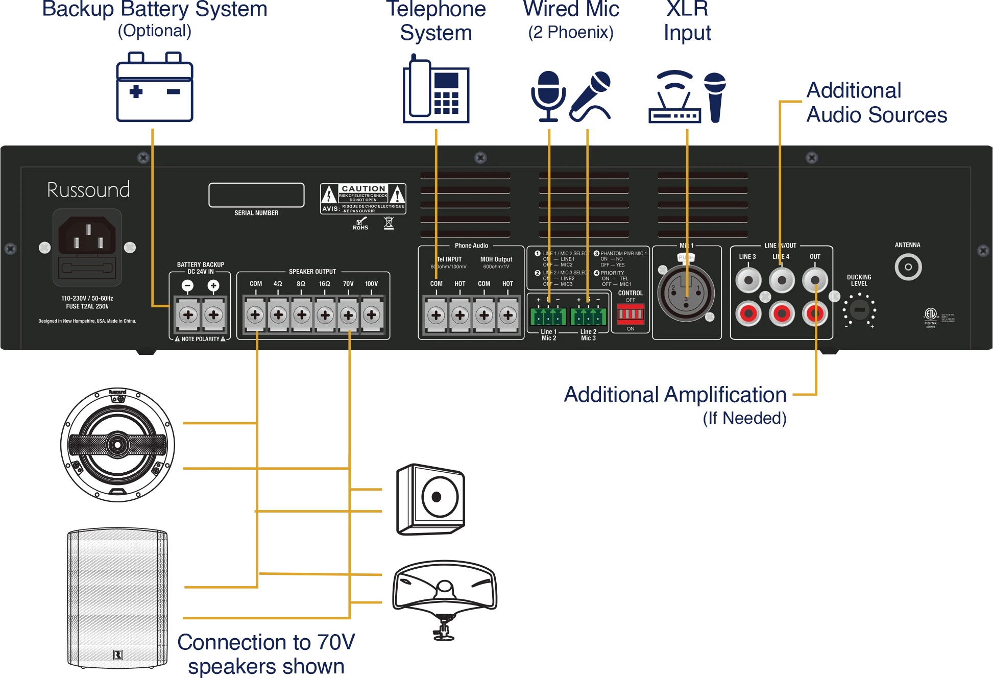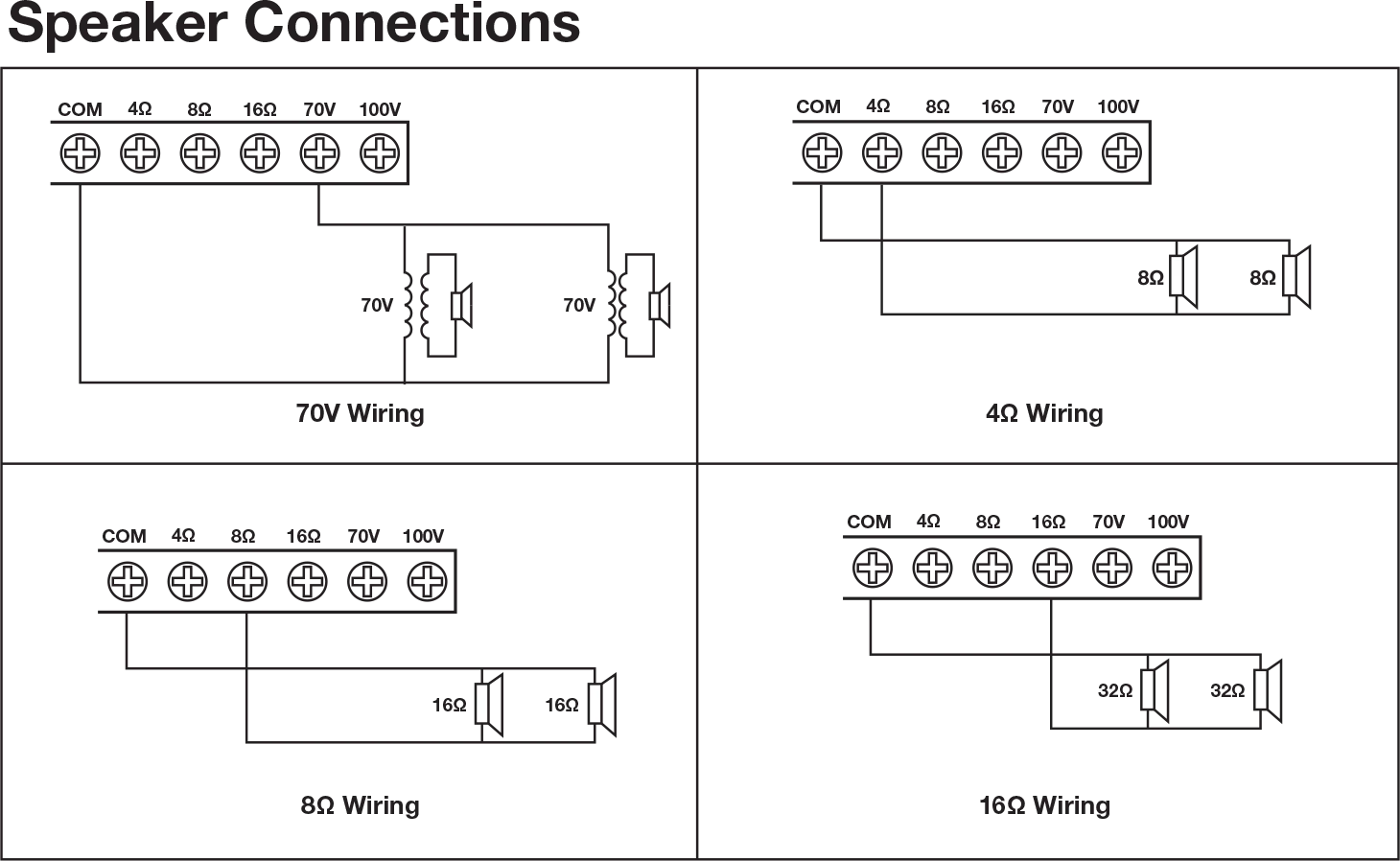 Speaker Outputs: 70V/100V/4Ω/8Ω/16Ω, RCA Line Out